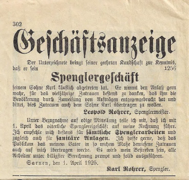1925: Geschäftsübergabe an die zweite Generation (Leopold an Karl Rohrer)